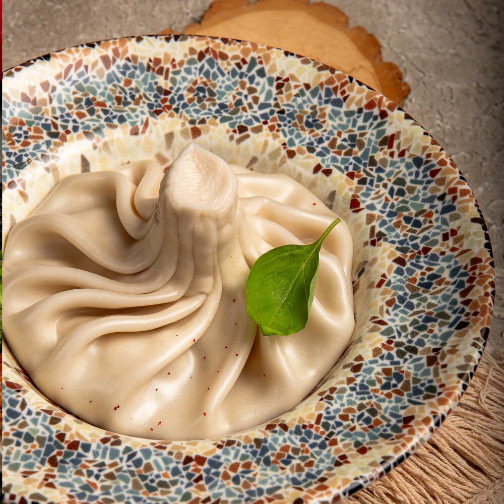 Самое большое хинкали с начинкой из ароматного куриного бульона с тархуном, специями и мини-хинкали из сочного мясного фарша внутри