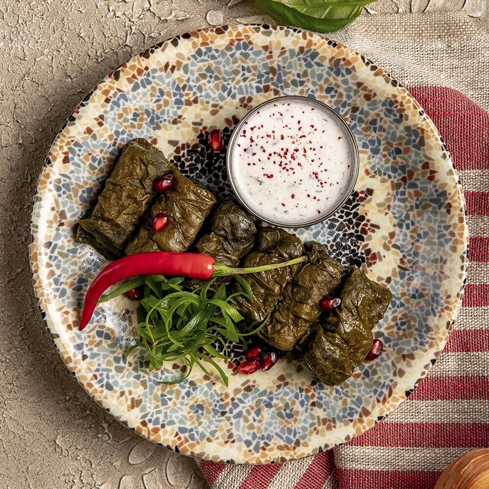 Нэжный мясной фарш, с любовью завёрнутый в виноградный лист, подаём со сливочным соусом с тархуном и грузинскими специями