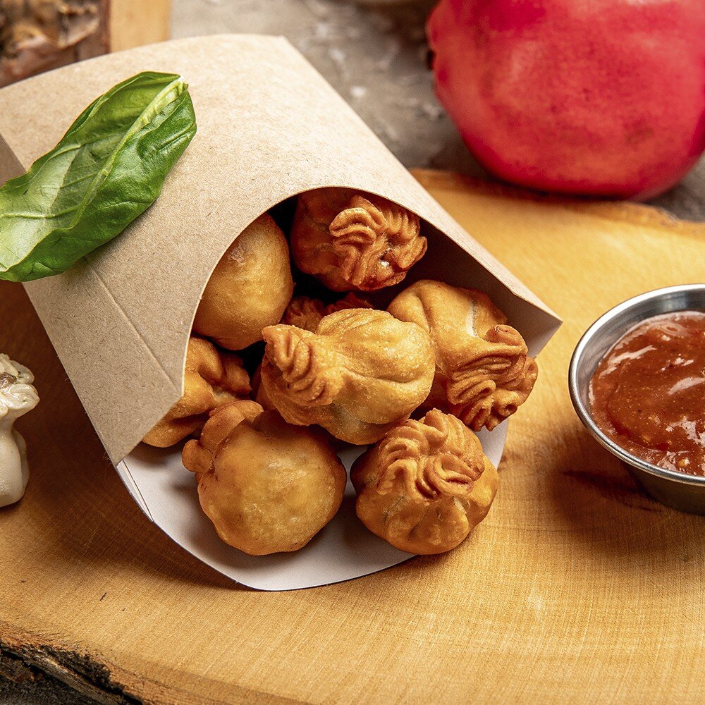 Мини-хинкали с мясным фаршем и фирменным соусом Al dente на основе вяленых томатов — яркая закуска, от которой невозможно оторваться