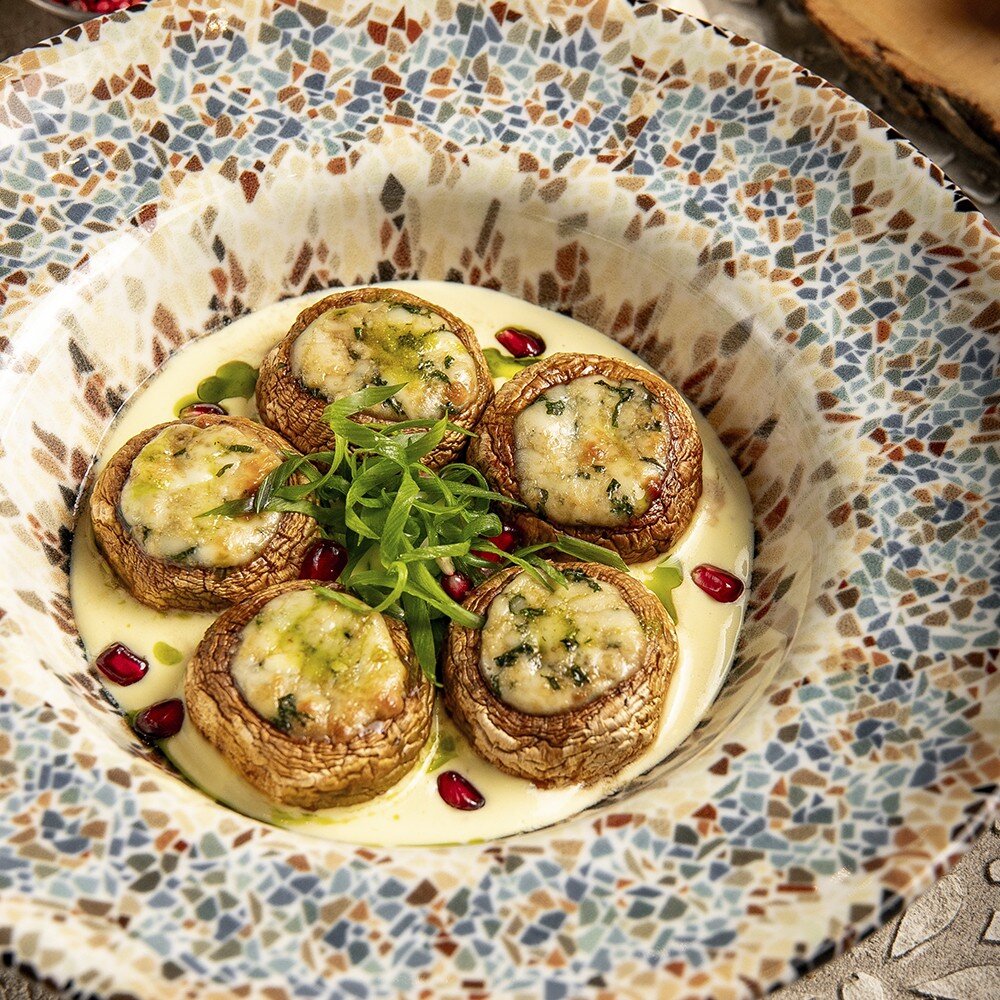 Запечённые шампиньоны с сочной сырной начинкой на подушке из сливочного соуса с чесноком