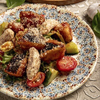 САЛАТ С КРИСПИ ШАМПИНЬОНАМИ И ЖАРЕНЫМ СЫРОМ