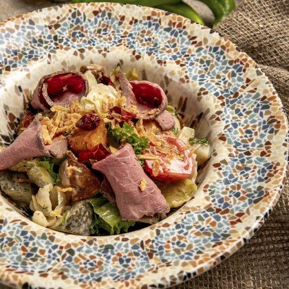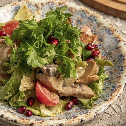 Хрустящие шампиньоны, жареный халуми, черри, огурцы, кинза, гранат и перчик чили — свежо, сочно и по-грузински ярко
