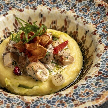 Сочная мраморная говядина на облачке картофельного пюре, в изысканном соусе демиглас с апельсином, чесноком, кориандром и сванской солью