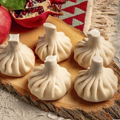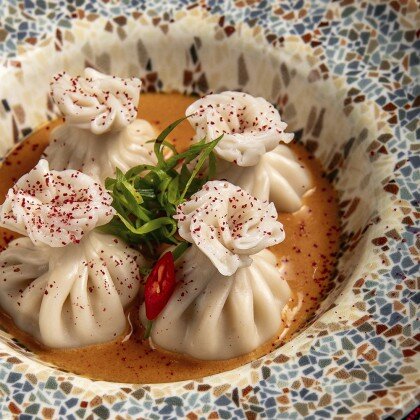 Самое большое хинкали с начинкой из ароматного куриного бульона с тархуном, специями и мини-хинкали из сочного мясного фарша внутри