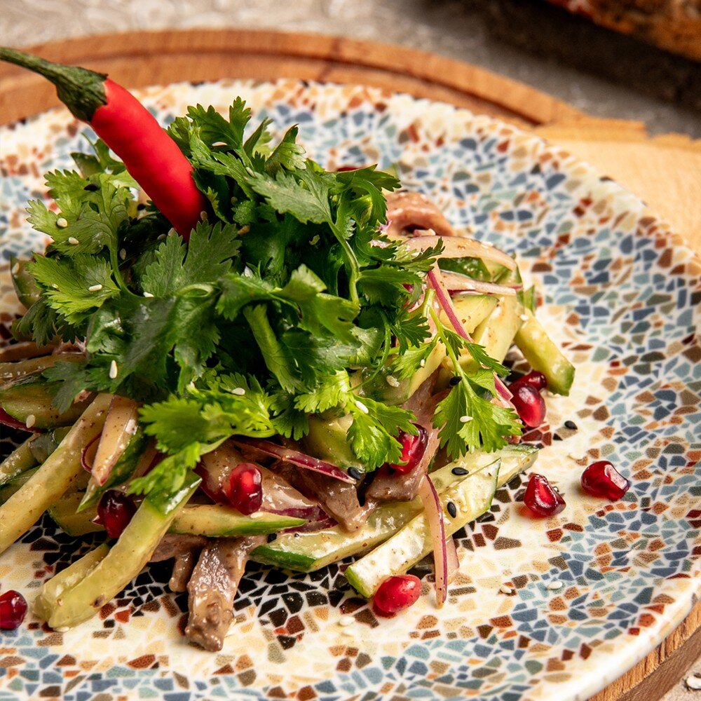 Телятина в овощном миксе из свежих огурцов, кинзы, красного лука с гранатом и соусом на основе оливкового масла, соевого соуса, яблочного уксуса, чеснока и грузинских пряных специй