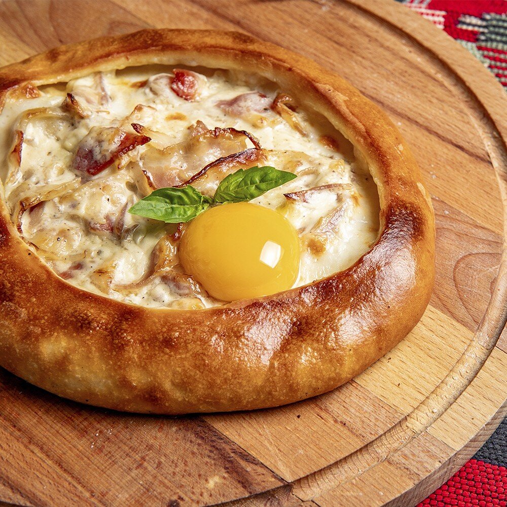 Грузинская лодочка с начинкой карбонара в итальянском стиле, тягучим сыром, беконом и желтком в центре. Мамма мия!